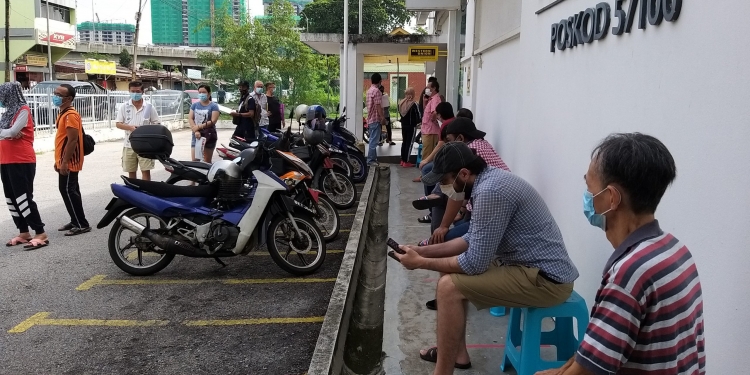 Bagi mengekalkan penjarakan sosial dan mencegah penularan wabak COVID-19, orang ramai perlu beratur panjang untuk melakukan pelbagai urusan di kaunter perkhidmatan kerajaan, perbankan dan pejabat pos.