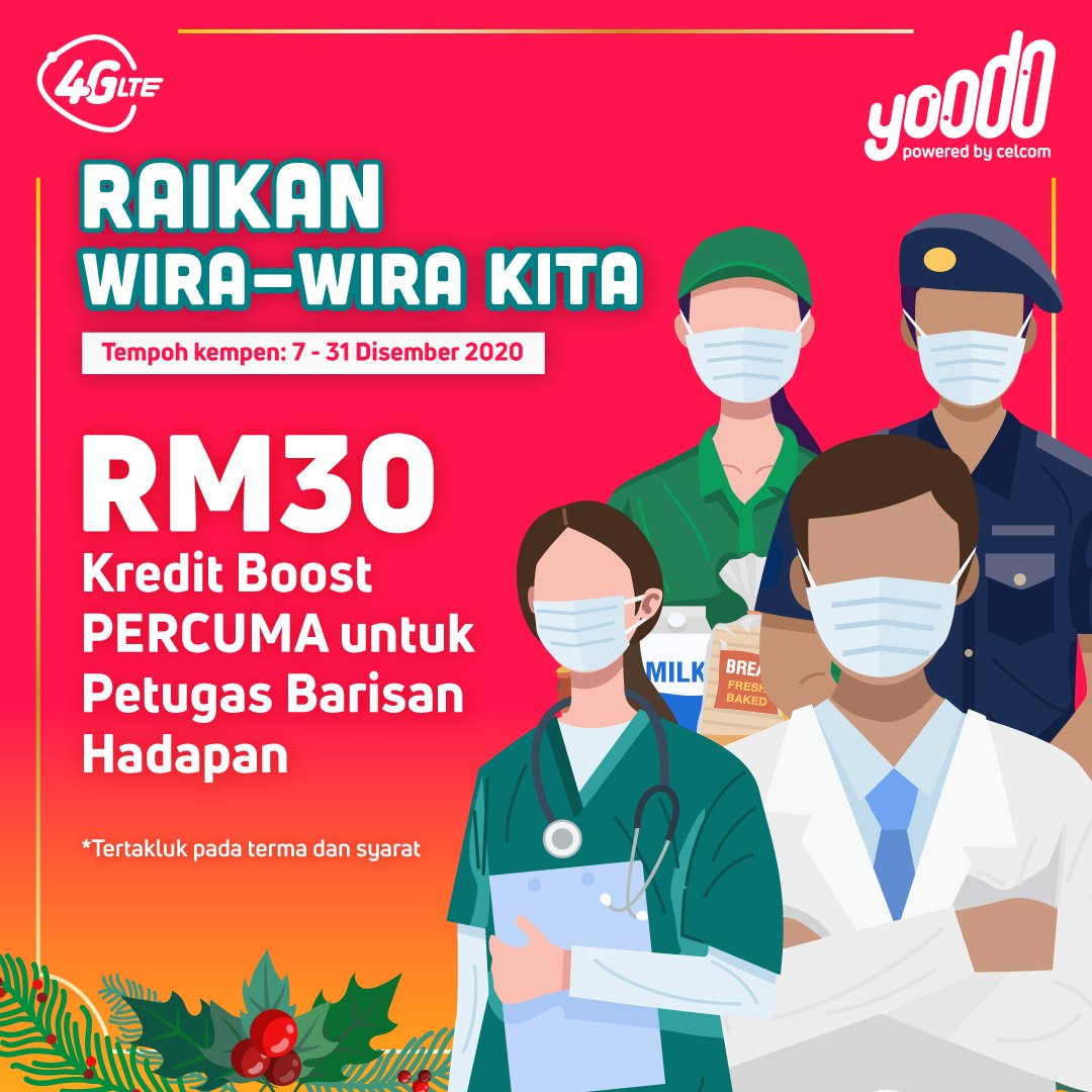 Promosi seterusnya diadakan khas untuk memberi penghargaan kepada petugas-petugas barisan hadapan. Melalui inisiatif Raikan Wira-Wira Kita, Yoodo akan memberikan RM30 kredit Boost secara percuma, kepada 500 petugas barisan hadapan terawal yang melanggan Yoodo. Kredit ini boleh digunakan untuk melanggan pelan Yoodo.